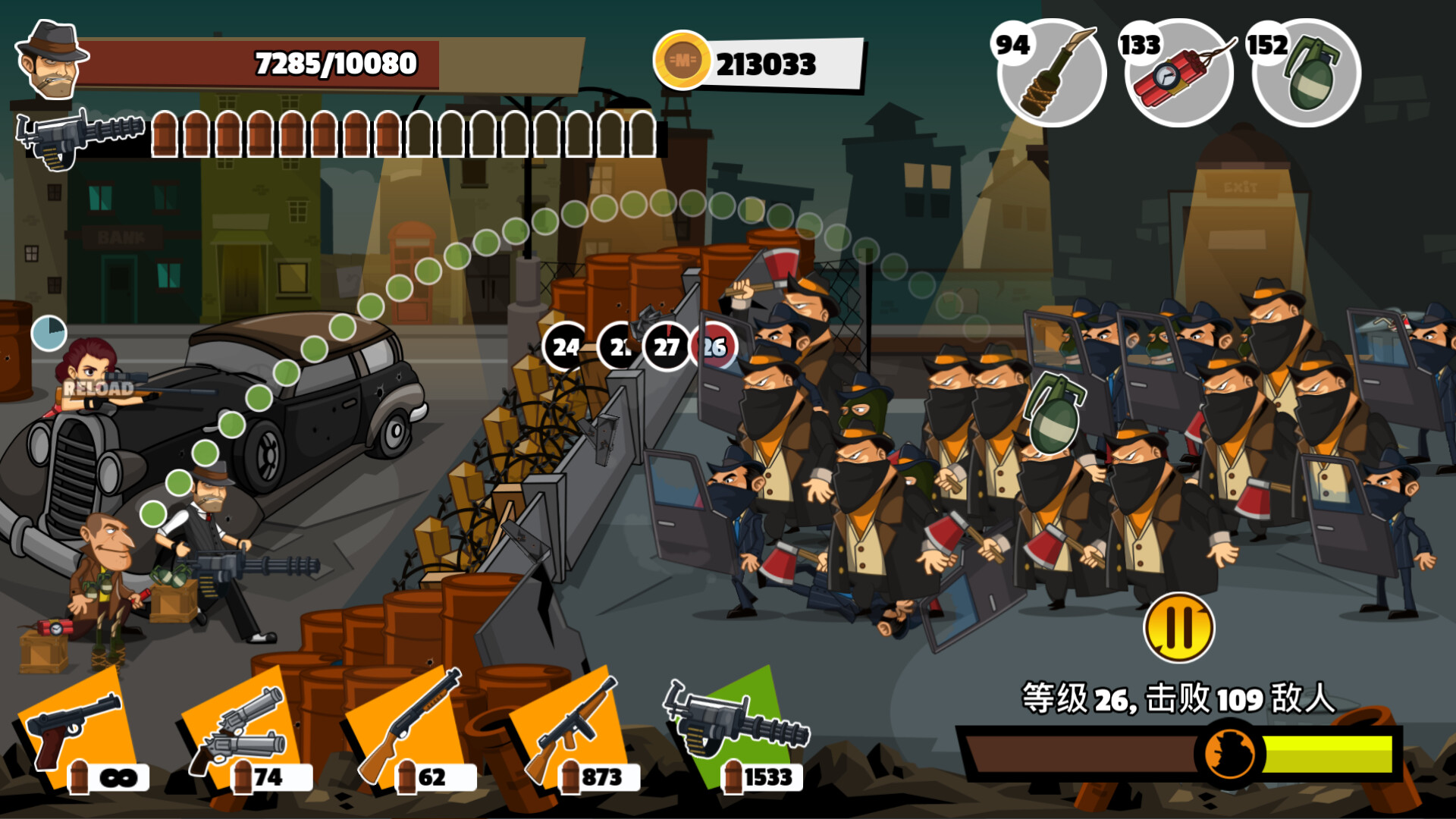 一款故事丰富的塔防自动战斗游戏,背景设定在喧闹的 20 年代黑社会。建立你的军火库和防御工事,与成群结队的敌方歹徒和强硬的老板作战。将你的炸弹放入人群中,观察火花四溅。通过幸运轮迷你游戏轻松赢取金币。