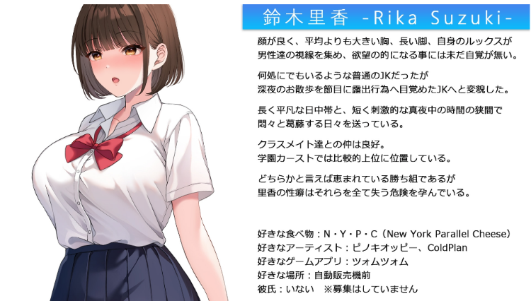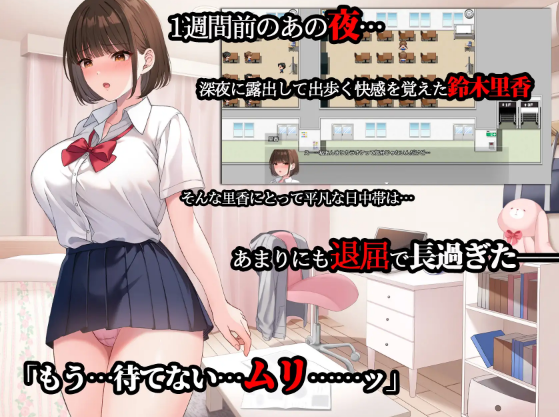 本作是以在前作《夜歩き》中觉醒了深夜解放感的里香的露出愿望为起点,记录了她从早上的学校开始,一整天侵蚀日常的过程的RPG形式的冒险游戏。