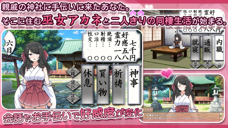在两人同居的生活中,一边做着会发生色色的事情的行为,一边操控巫女对你的好感度,让她完美的素颜崩坏!