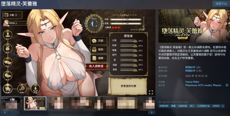 《堕落精灵·芙蕾雅》是一款互动调教类游戏,在游戏中我们将扮演兽人,对精灵女王芙蕾雅进行调教 您可以在游戏中对芙蕾雅尽情宣泄兽欲,让芙蕾雅臣服于您!游戏中内置双结局,也有生产怀孕要素。