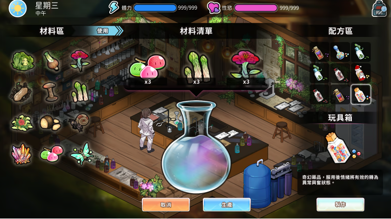除了经营浴场赚钱以外,还有前往深山採取异世界植物进行特效药的製作高价贩售,以及其他各种赚钱管道进行资金的赚取。玩家可以在一天的四个时段当中前往各个区域与各式各样的人物进行交谈与互动,获取资讯与利益交换来提升自己的赚钱能力,获得更高的报酬利益与增加与女主角们的好感度。